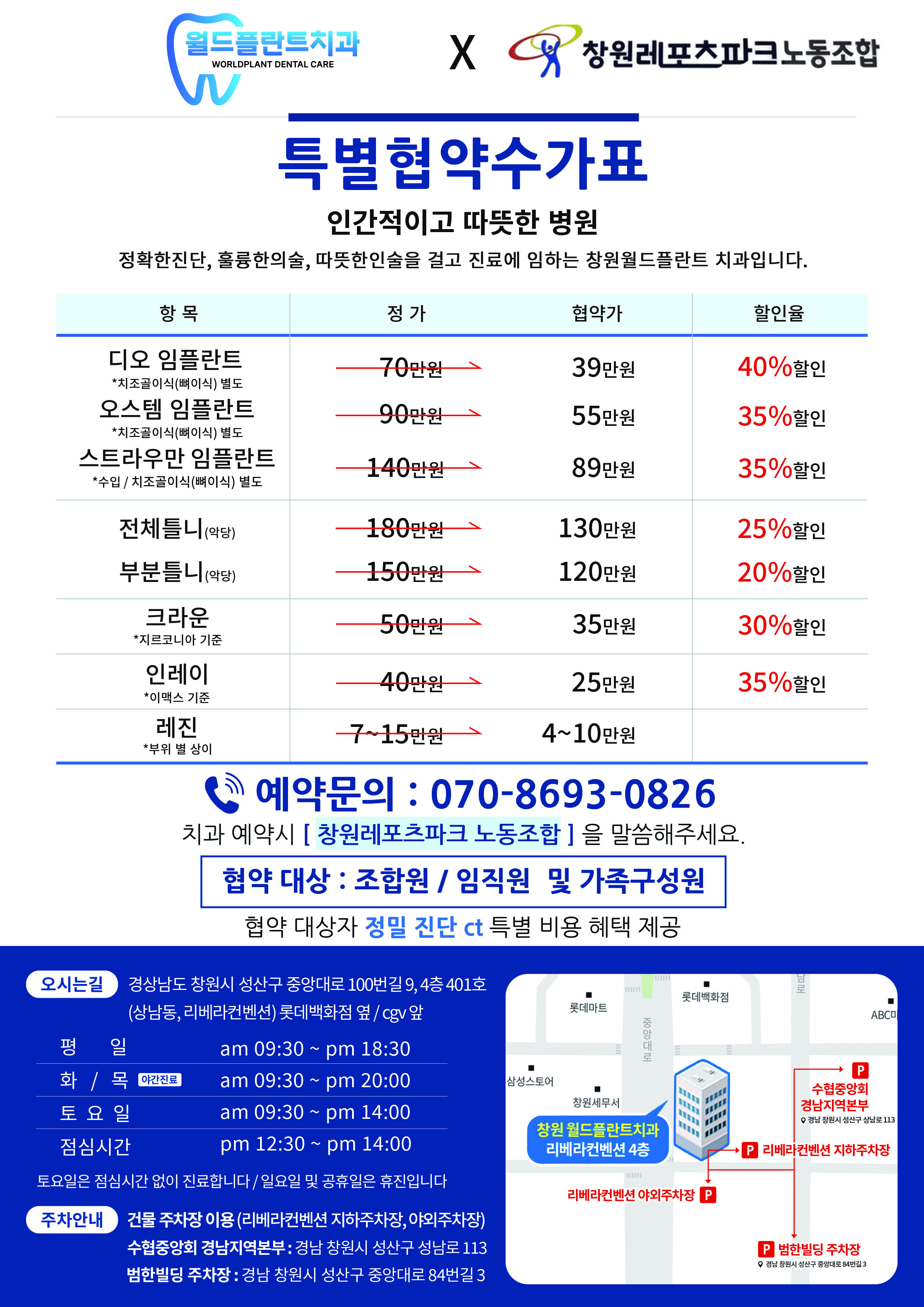¿ùµåÇöõƮġ°ú¿Í Çù¾àÀ» ü°áÇÏ¿´½À´Ï´Ù.. Ä¡°ú ¿¹¾àÀº Àü¿ë¹øÈ£ "070-8693-0826"¸¦ ÀÌ¿ë¹Ù¶ó¿À¸ç â¿ø·¹Æ÷Ã÷ÆÄÅ©³ëµ¿Á¶ÇÕ À¸·Î Çù¾àµÇ¾îÀÖ½À´Ï´Ù... [Á¶ÇÕ¿ø, ÀÓÁ÷¿ø, °¡Á·±¸¼º¿ø]´ë»óÀÔ´Ï´Ù..